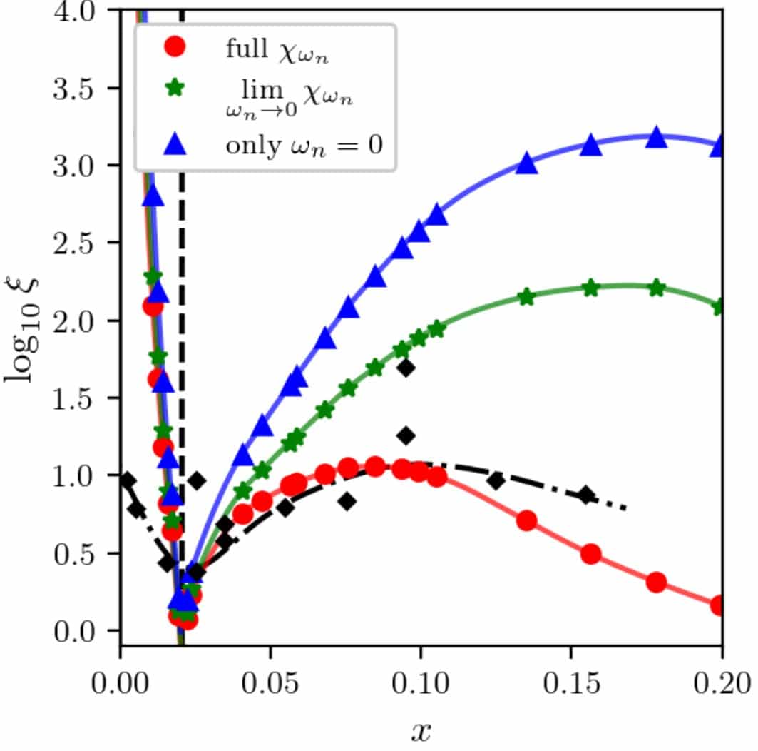 Расчеты показали, что с ростом частоты колебаний временная спиновая жесткость в купратах резко падает. Этот эффект, который можно сравнить с «размягчением» магнитной системы на высоких частотах, приводит к сильному подавлению квантовых флуктуаций и не позволяет магнитному порядку распространяться на большие расстояния. В итоге вычисленная длина корреляции оказалась на удивление короткой и практически идеально совпала с экспериментальными данными для одного из самых изученных купратов, La₂-ₓSrₓCuO₄.