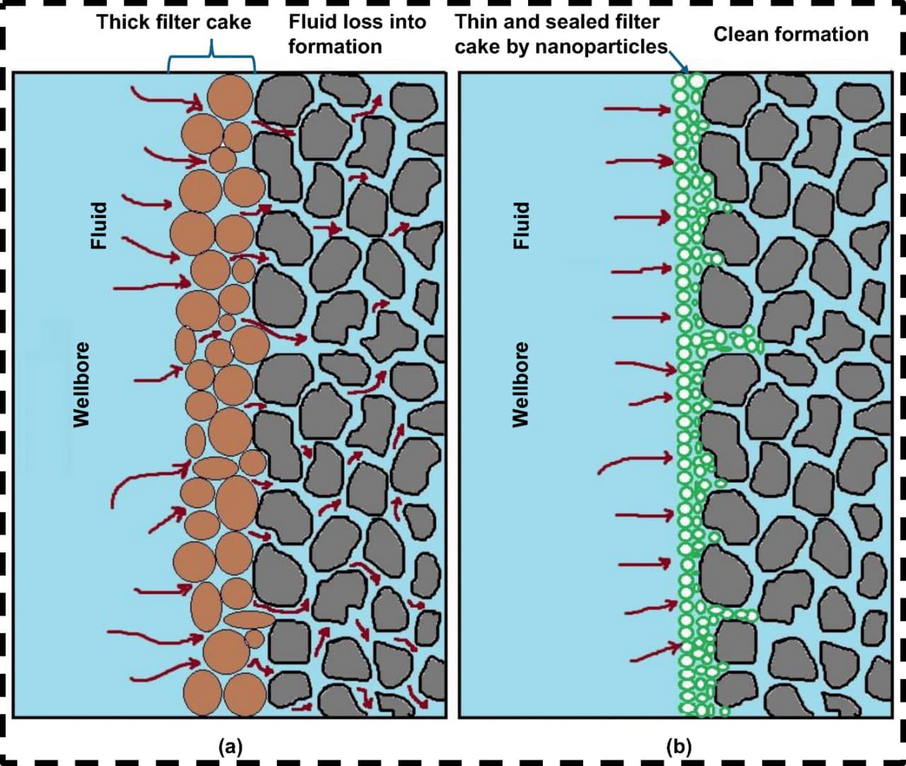 Схема механизма, иллюстрирующая, как работает система контроля потерь жидкости в буровых растворах, — сравнение (а) образования обычной фильтровальной корки из более крупных частиц и (б) улучшенной, намного более тонкой и плотной наноусиленной корки, образующейся из наночастиц на стенке скважины / © Пресс-служба ПНИПУ