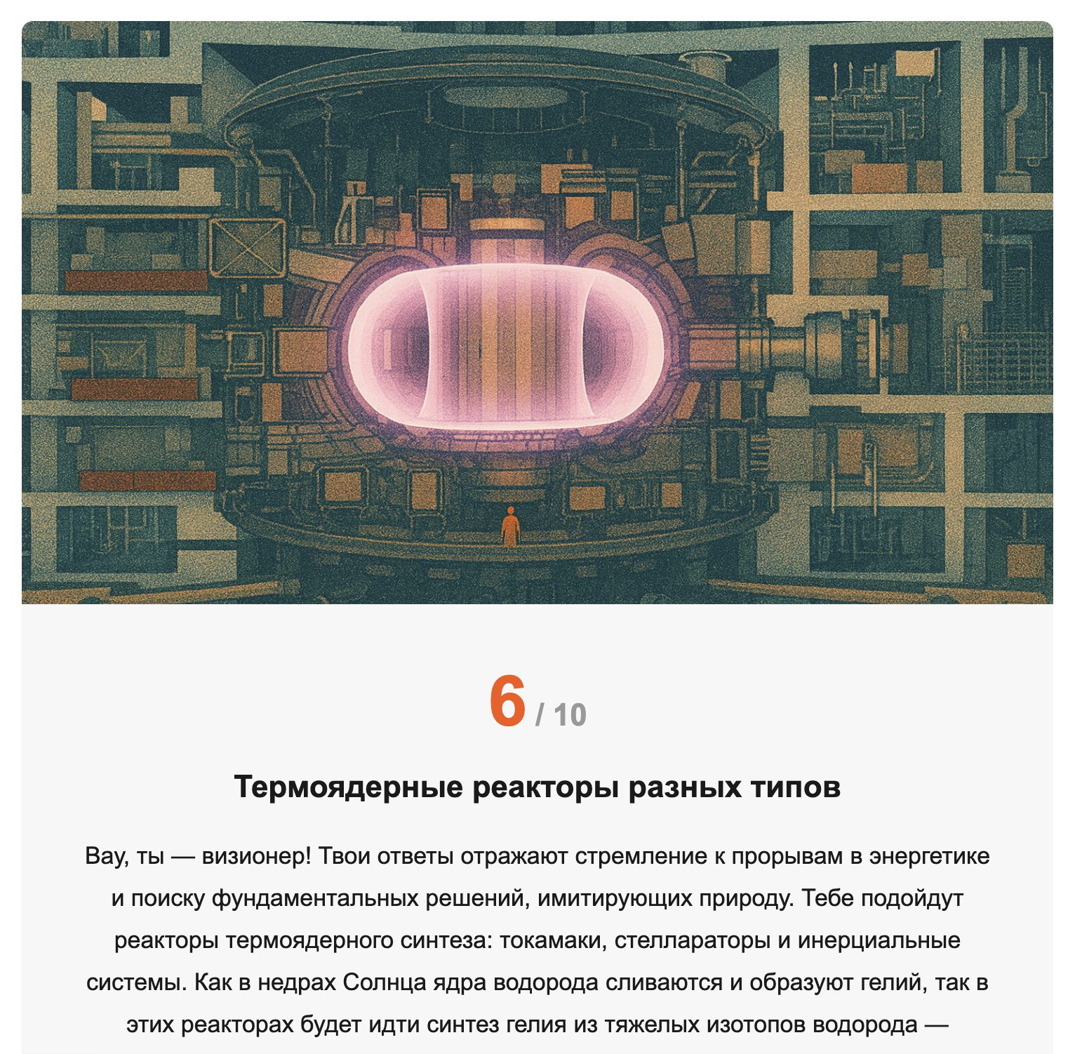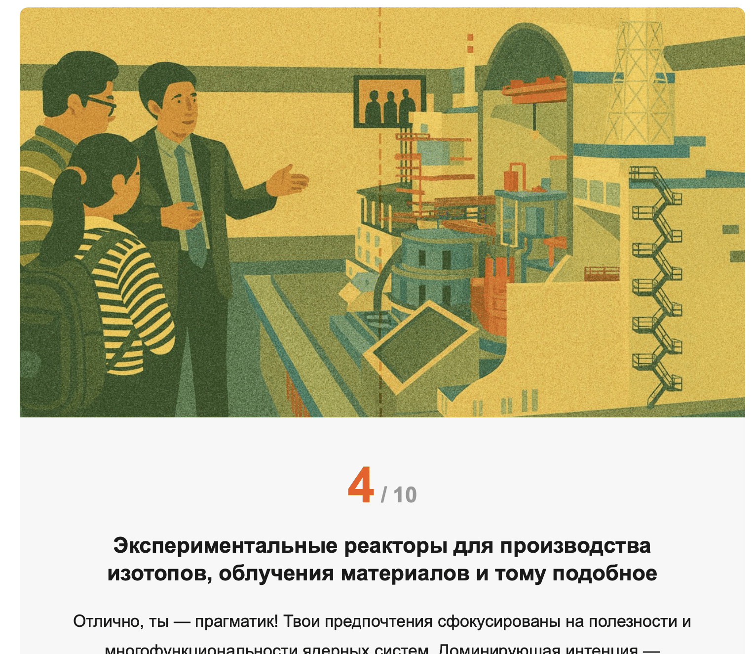 В этом квизе нет правильных и неправильных ответов. Все варианты имеют право на существование. Выбор отражает личные или социальные приоритеты. Поскольку такие вопросы часто завязаны на эмоции и смутные ощущения, мы избегаем диктовать правильные ответы, но показываем, что атомная отрасль имеет проекты, соответствующие разным интенциям. Итогом квиза будет рекомендация, в создании какого типа инновационных реакторов было бы оптимально работать участнику опроса с учетом его предпочтений и склонностей. Это позволит ему соотнести и ассоциировать себя с атомными проектами.