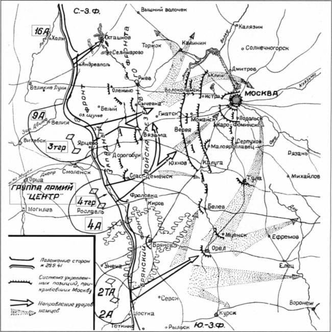 С 30 сентября по 5 декабря 1941 года немецкие войска пытались наступать на Москву. Противостоявшие им здесь советские командиры фронтов — Конев, Еременко и Буденный «не увидели» ударные группировки противника. Поэтому многочисленные советские силы — 1,25 миллиона человек, тысяча танков, 1370 самолетов — получили удары немецкими клиньями по самым слабым точкам своего фронта, где войск было немного.