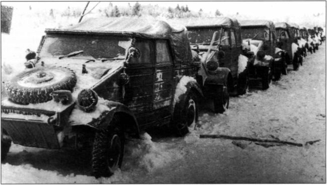 Volkswagen Kübelwagen, немецкий штабной легкий автомобиль повышенной проходимости времен войны (мотор мощностью в 23,5 л.с.). Разработан Ф.Порше, максимально унифицирован с известным «Жуком» того же конструктора. Эта колонна из декабря 1941 года брошена исправной, но не из-за мороза: ей просто не хватило топлива, перебои с которым у немцев начались еще осенью 1941 года / © Wikimedia Commons