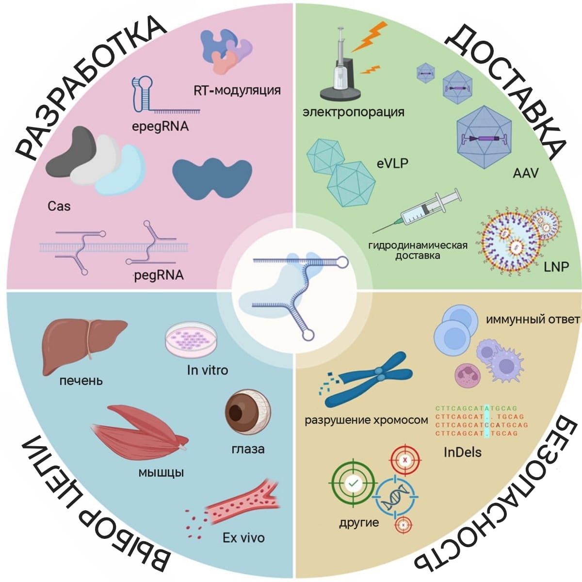 То есть Cas9 делает надрез одной цепи ДНК, освободившийся конец находит на pegRNA нужный участок и обратная транскриптаза дописывает новый фрагмент прямо в разрыв. В итоге праймированное редактирование позволяет аккуратно добавлять или удалять конкретные участки генетической информации, работая только с одной нитью ДНК и становясь своеобразным «текстовым редактором». Однако на практике возникли проблемы с эффективностью и доставкой.
