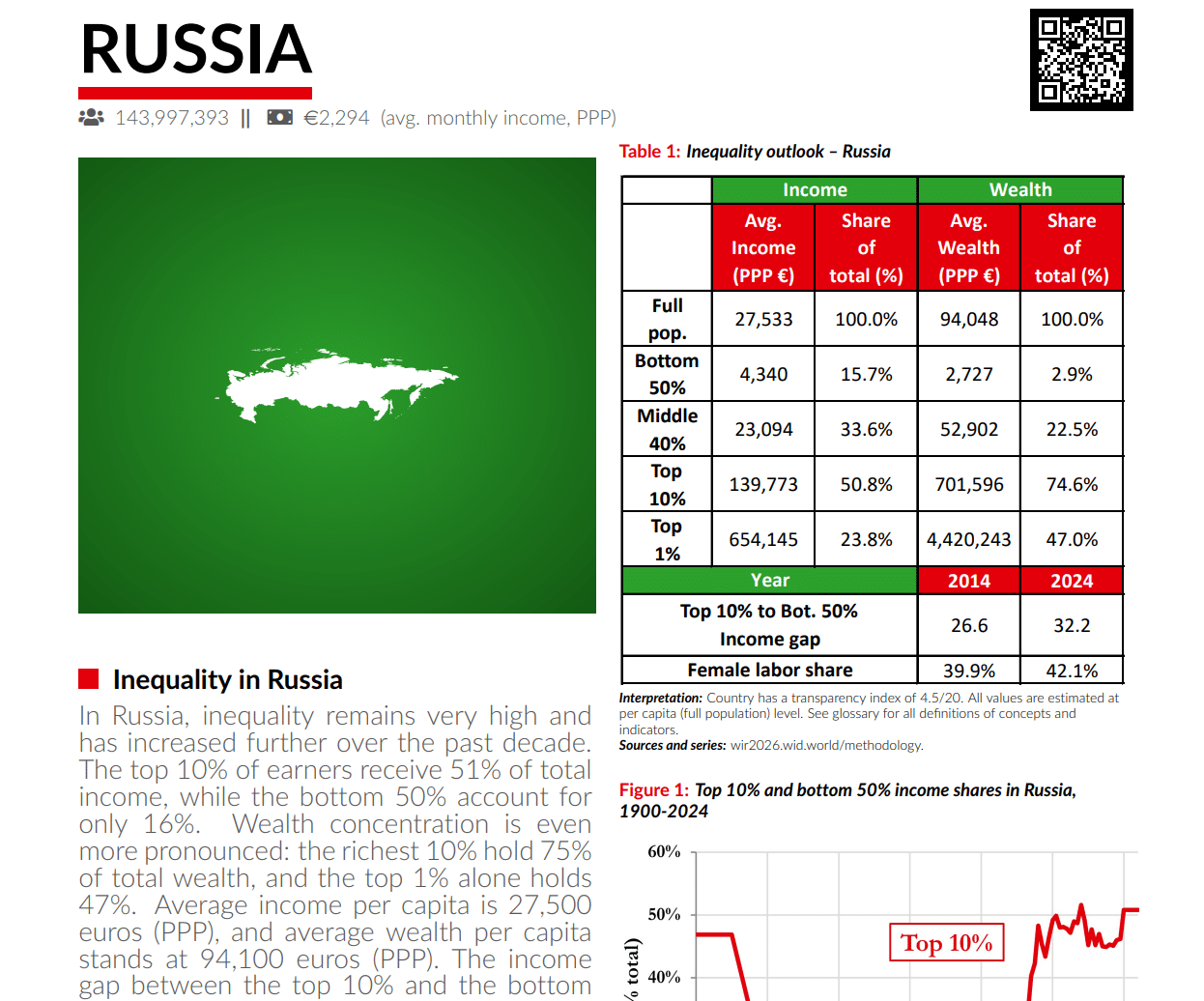 После этого при Парижской школе экономики (которую возглавлял Пикетти) возникла Мировая лаборатория неравенства, куда входит немало именитых экономистов и кроме него. В этом декабре лаборатория представила отчет «Мировой доклад о неравенстве». В нем определенное место отведено и нашей стране.
