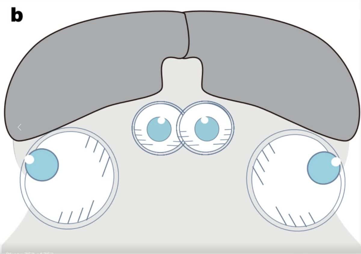 Авторы новой работы в Nature тщательно исследовали остатки десяти этих существ и пришли к необычному выводу: они имели сразу четыре глаза камероподобного типа (такие же у современных позвоночных, включая нас). На остатках они выглядят как четыре черных пятна, расположенных спереди, по бокам головы.