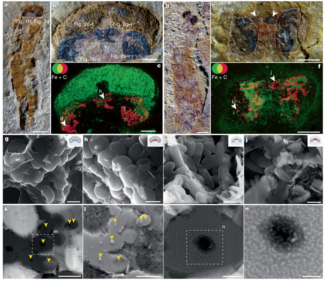Палеонтологи с помощью рентгеновского излучения и сложных типов спектроскопии показали, что все четыре пятна имеют близкий химический состав. А электронная микроскопия продемонстрировала наличие там продолговатых или цилиндрических микротелец от 200 до 1200 нанометров в длину.