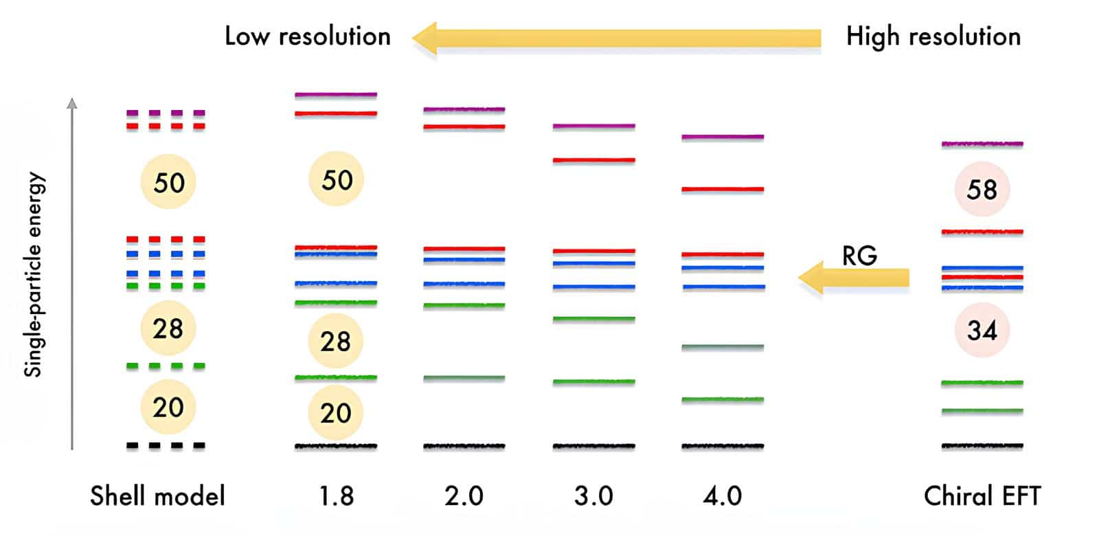 Энергии протонов в олове-132 в зависимости от энергетического разрешения. Справа — спектр для единичных частиц, рассчитанный по хиральной EFT (эффективной теории поля). Слева пунктиром — спектр, полученный из оболочечной модели по экспериментам. Прямыми линиями слева показан энергетический спектр, полученный уменьшением энергетического разрешения по ETF. Магические числа для оболочечной модели совпадают с числами для низкого разрешения / © адаптированное для https://physics.aps.org/ изображение из C.R. Ding et al.