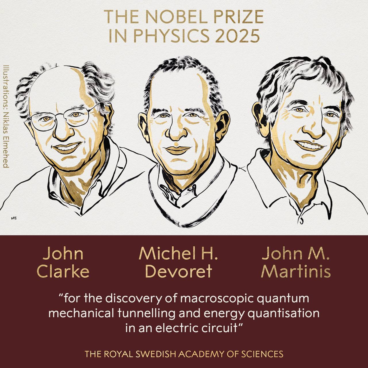 Нобелевскую премию по физике 2025 года получили ученые Джон Кларк, Мишель Деворе и Джон М. Мартинис.