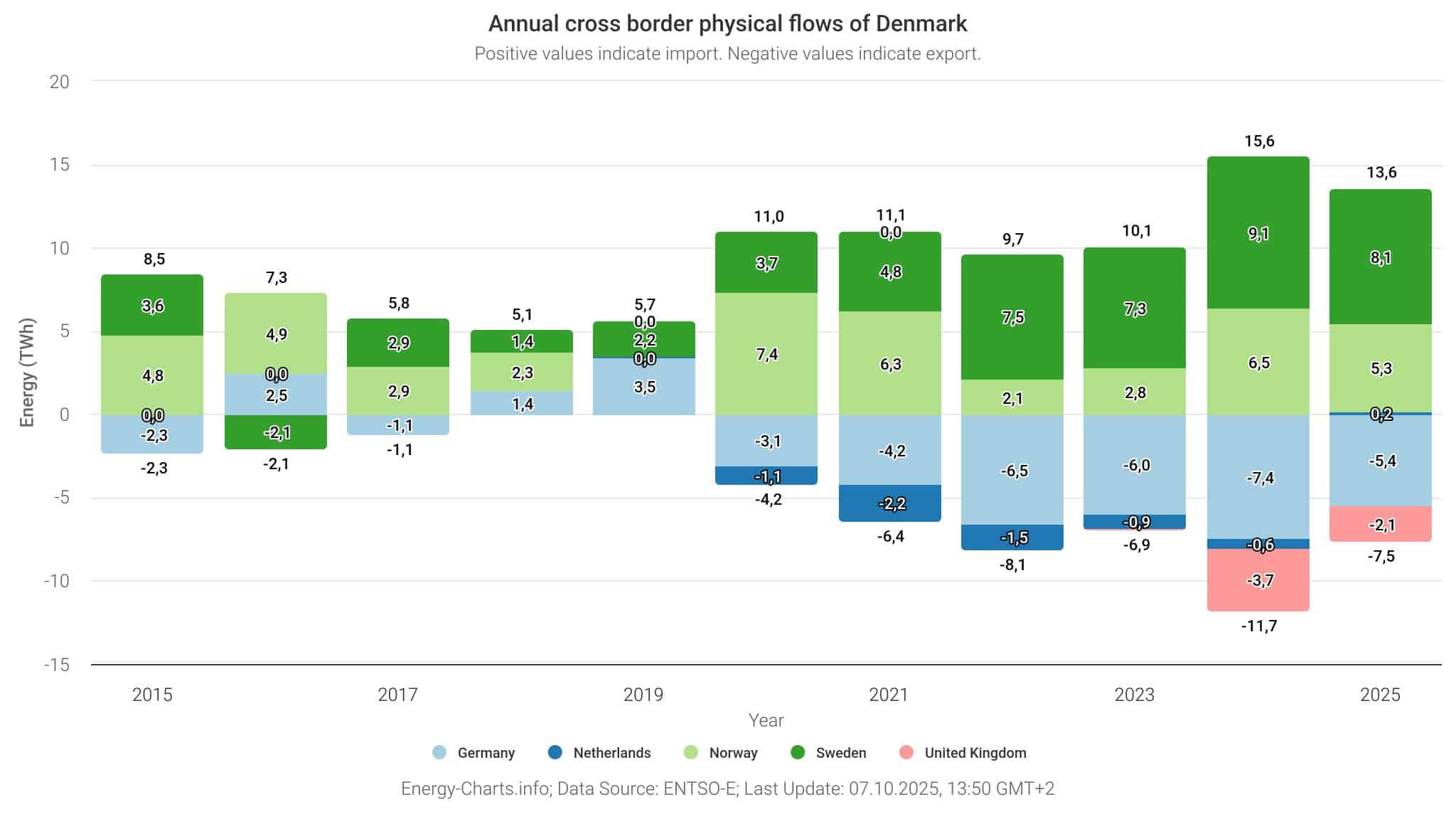 Ar, "Тимур, в Дании последнее время больше среднегодового экспорта чем импорта" Ага. Ну конечно: "In 2024, Denmark had net electricity imports of 3.7 TWh, a figure that increased by 19.4% compared to 2023" https://forsyningstilsynet.dk/Media/638924853153921019/2025%20National%20Report%20.pdf