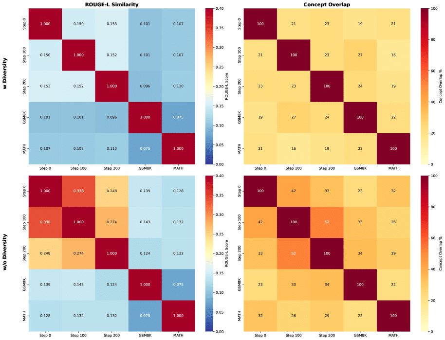 Включение вознаграждения за разнообразие приводит к генерации задач с низкой текстовой схожестью и минимальным перекрытием концепций, что свидетельствует об эффективном исследовании различных типов задач.