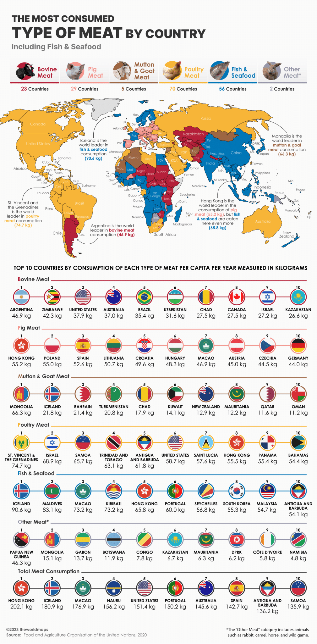 В инфографике выше представлены страны, где потребление мяса на душу населения является наибольшим, основываясь на данных Продовольственной и сельскохозяйственной организации ООН (ФАО).