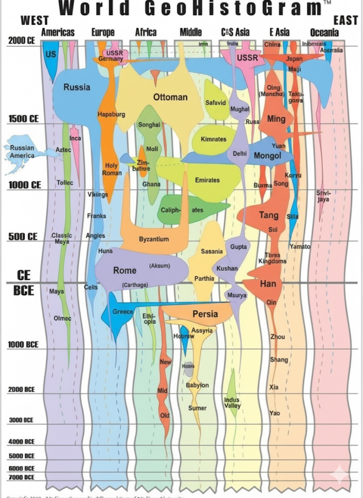 Однако World GeoHistogram — полезное упрощение, ведь структура неизбежно исключает многие общества, не вписывающиеся в модель «крупной империи». Цивилизации без централизованных государств, письменности или значительного контроля над территориями — многие коренные культуры Америки, тропической Африки, Океании и Арктики — в ней почти не представлены. Так же обделены вниманием влиятельные кочевые объединения и региональные города-государства.