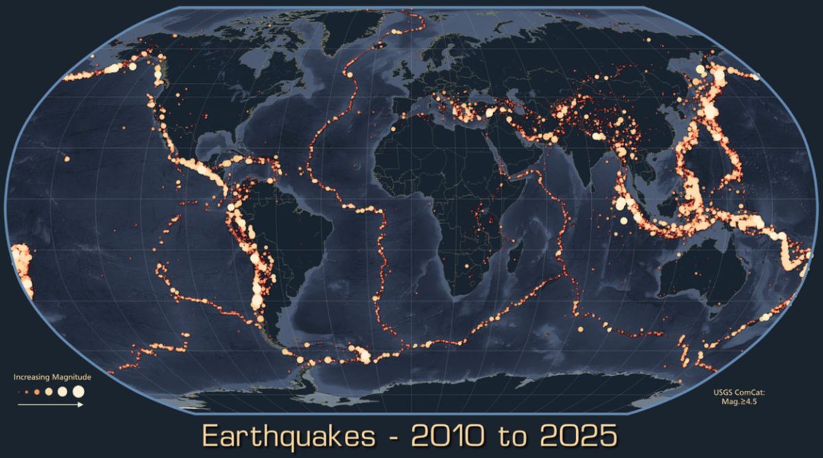 На Земле каждый день может происходить несколько тысяч землетрясений, но большинство из них незаметны простым людям. На карте отмечены землетрясения с магнитудой выше 4,5 балла, произошедшие с 2010 по 2025 год.