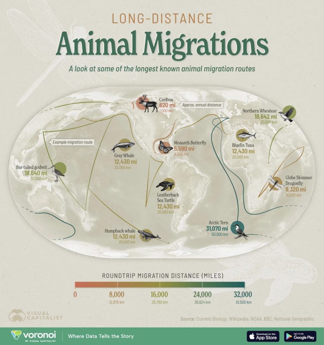 Эта визуализация отображает некоторые из самых длинных известных миграционных маршрутов на Земле. От полета полярной крачки от полюса к полюсу до эпических океанских странствий китов и морских черепах — все эти маршруты связывают экосистемы по всему миру и формируют целые пищевые сети.