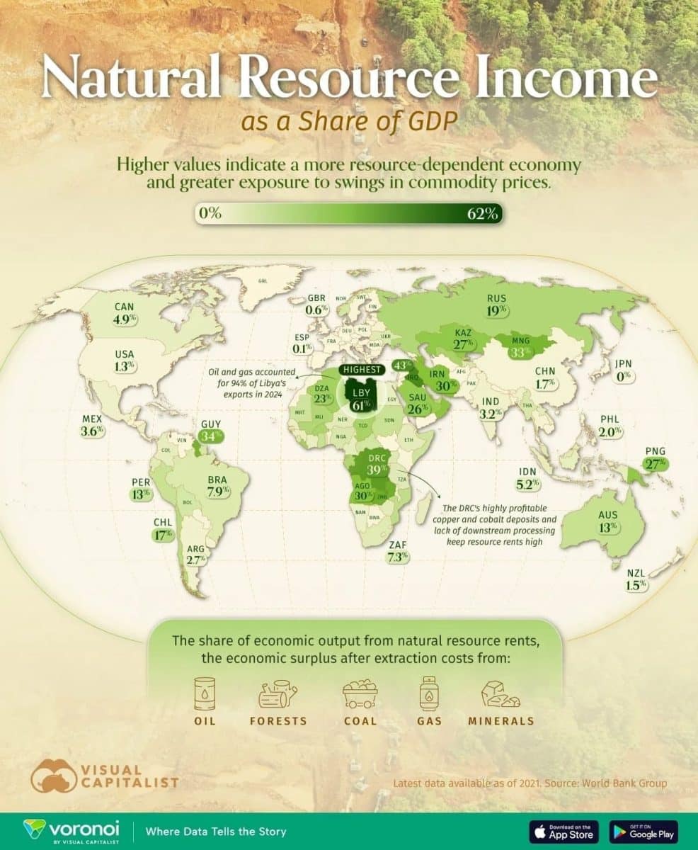 Новая визуализация, основанная на данных, предоставленных Группой Всемирного банка, показывает доходы от природных ресурсов в доле валового внутреннего продукта (ВВП), наглядно демонстрируя, какие страны в наибольшей степени зависят от добычи и продажи сырья. В них отражена доля ресурсной ренты в ВВП — то есть экономический излишек, получаемый от нефти, газа, угля, полезных ископаемых и лесных ресурсов после вычета затрат на их добычу.