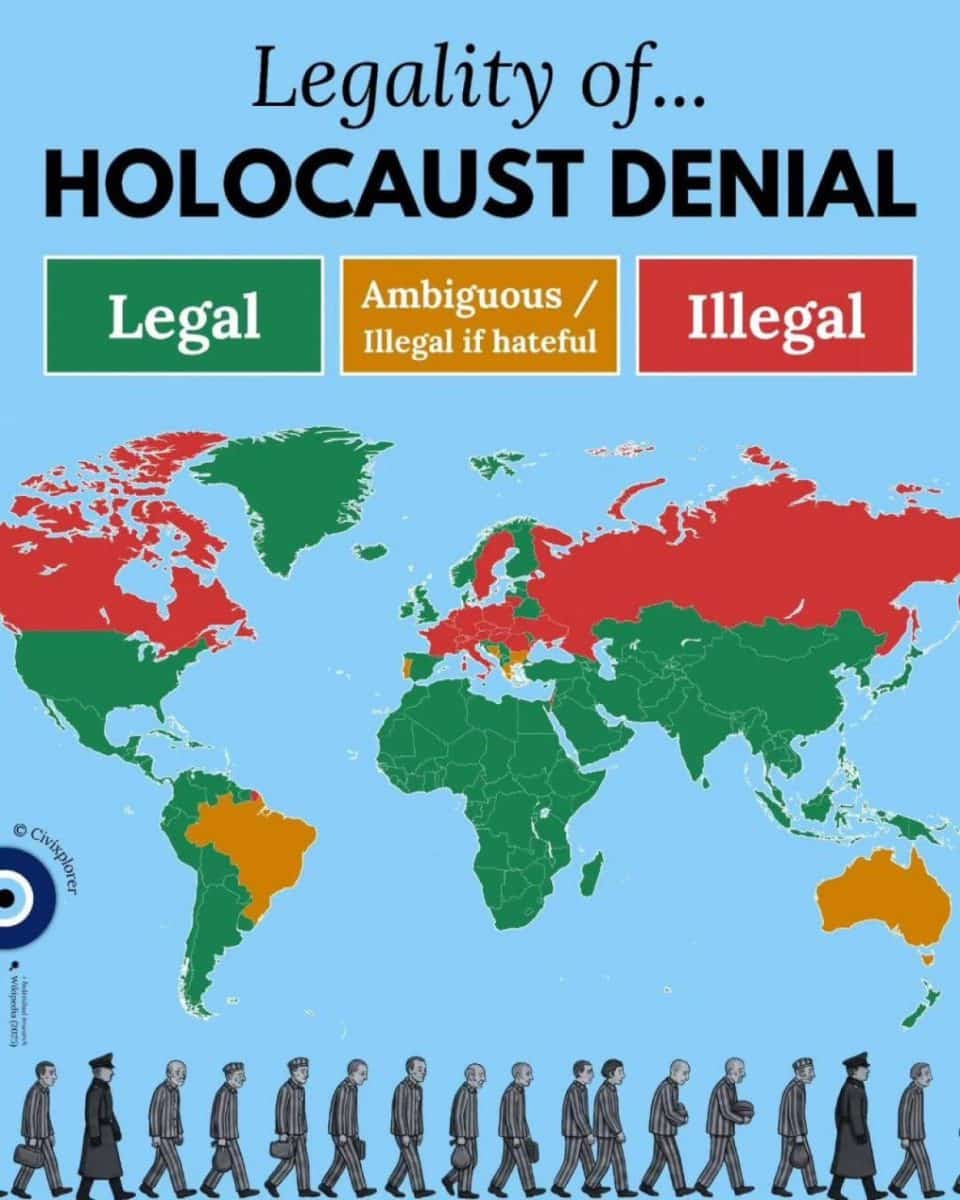 В результате Холокоста в Европе погибли около шести миллионов евреев. Авторы карты красным отметили страны, которые на законодательном уровне запретили отрицание Холокоста. Желтым выделены страны, в которых нет однозначного запрета или отрицание Холокоста наказывается в случае разжигания ненависти.