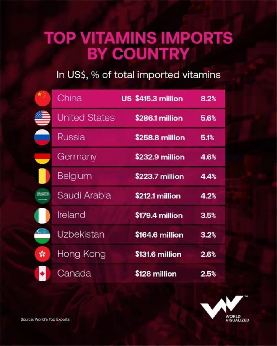 Новые торговые данные проекта World’s Top Exports показали, какие страны импортируют витамины в наибольших объемах в стоимостном выражении, и результаты наглядно отражают устойчивые экономические и отраслевые закономерности.