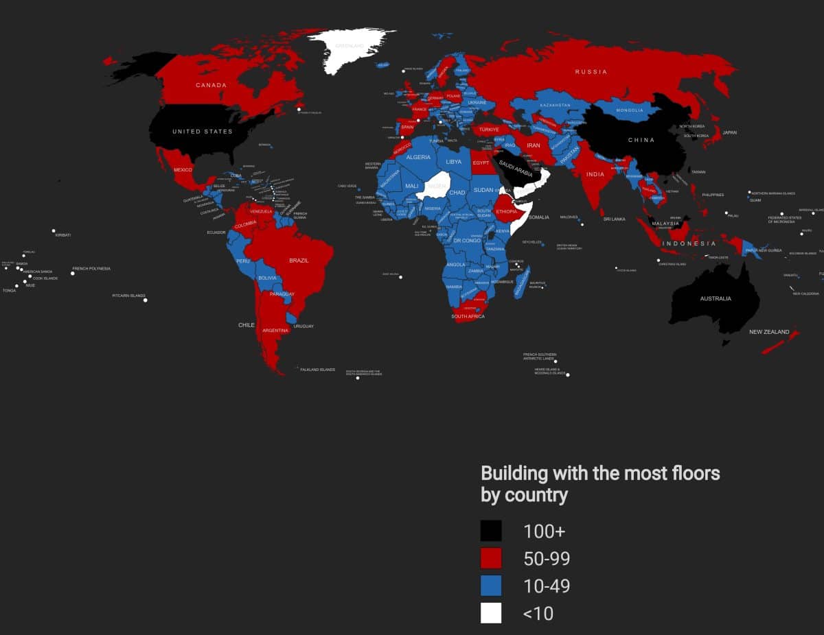 Этажность застройки влияет на общий облик городов. На инфографике страны мира выделены разными цветами в зависимости от количества этажей в самом высоком здании.