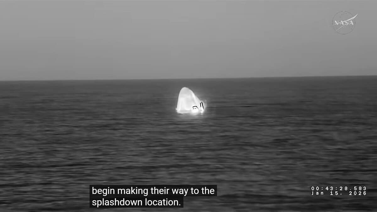 Корабль Dragon с космонавтами Зеной Кардман, Майклом Финком, Кимия Юи и Олегом Платоновым приводнился в Тихом океане у побережья Калифорнии 15 января 2026 года.