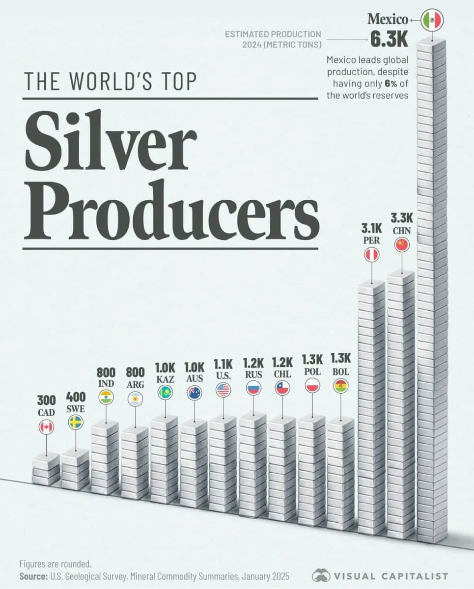 Во всем мире в 2024 году произвели 24 тысячи тонн серебра. Лидером на этом рынке с 6,3 тысячи тонн стала Мексика, хотя на нее приходится около 6% мировых запасов.