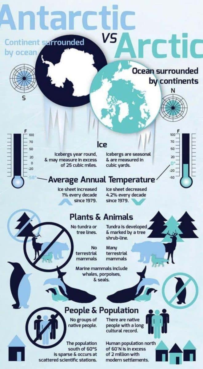 Антарктида и Арктика — два противоположных полюса планеты. На инфографике показаны основные различия между ними.