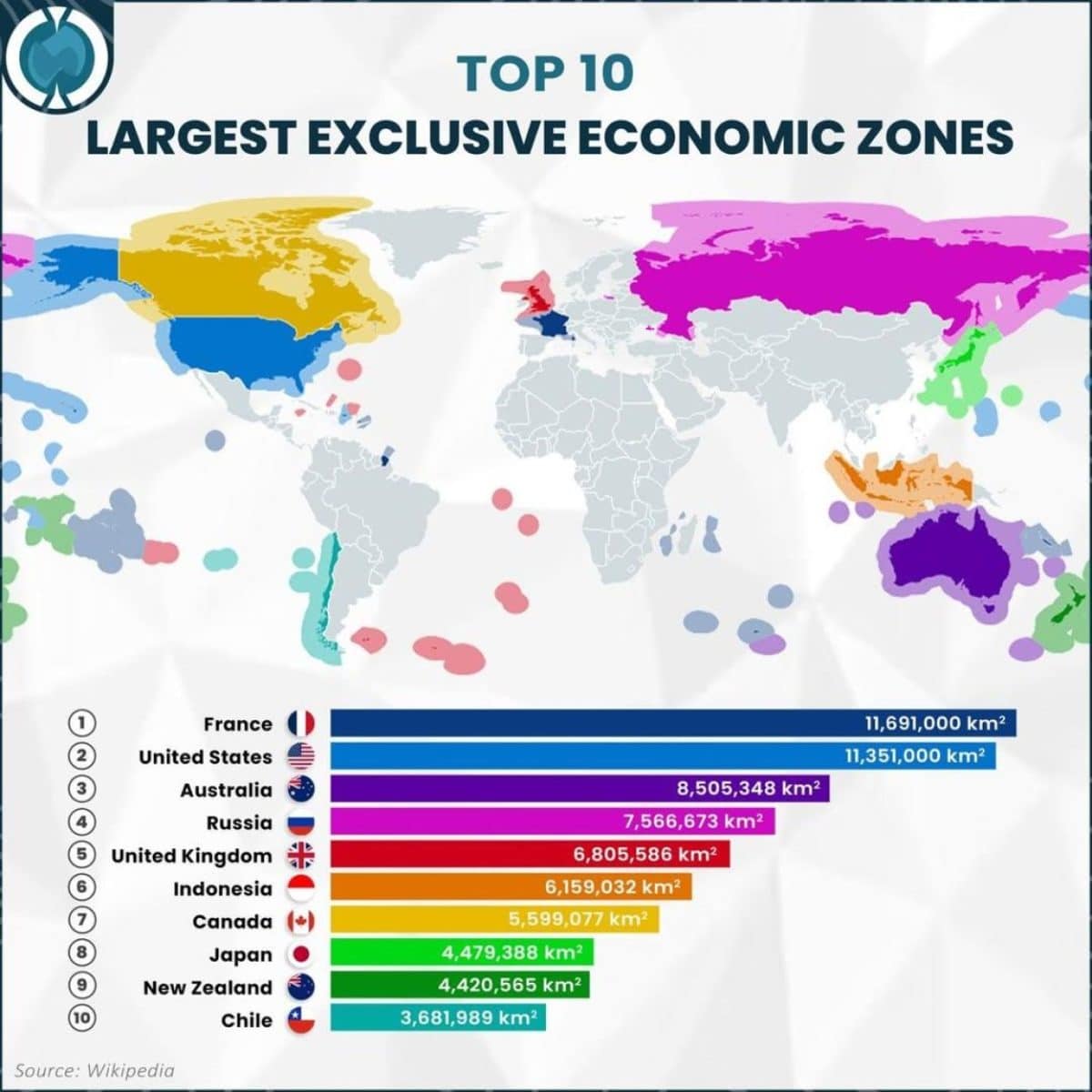 Самой большой исключительной экономической зоной обладает Франция, в первую очередь благодаря своим заморским территориям. Ее площадь составляет 11,691 миллиона квадратных километров.