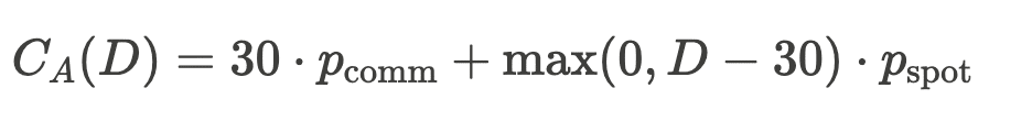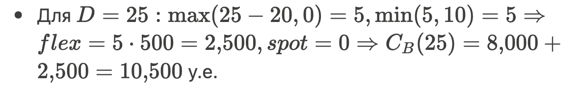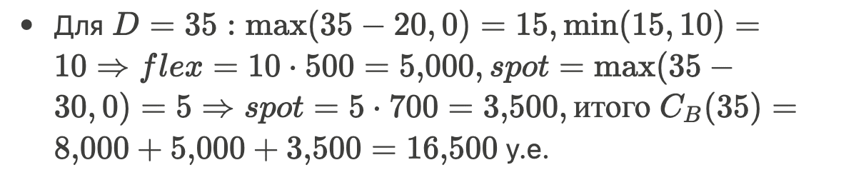 Пояснение: первые 30 loads это наш committed флот. Мы за них уже заплатили. Если спрос D>30, экстренно докупаем (D — 30) spot-блоков.
