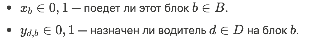 В модели используются двоичные переменные двух типов: переменные x_b, определяющие, будет ли выполнен блок b, и переменные y_(d,b), указывающие, назначен ли водитель d на блок b.