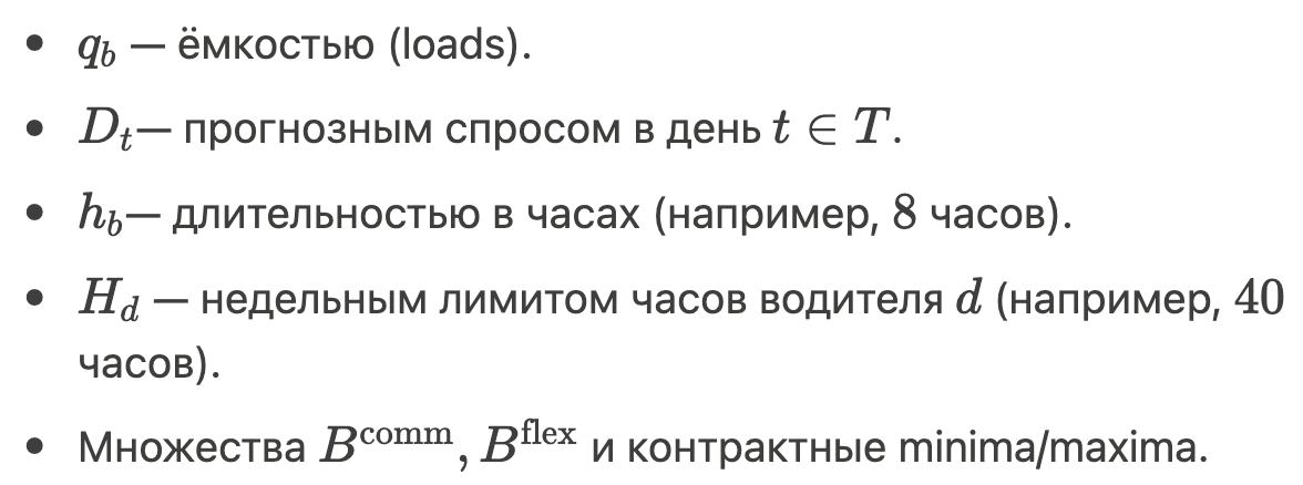 Каждый блок характеризуется своей вместимостью q_b (объём груза), продолжительностью h_b в часах и привязкой к определённому дню недели. Водители имеют индивидуальные недельные лимиты рабочих часов H_d и набор допусков к различным типам работ.