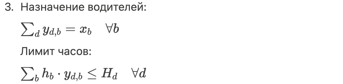 Третья группа ограничений касается рабочего времени и назначения водителей. Каждый активированный блок должен быть назначен ровно одному водителю, что обеспечивается соответствующим уравнением. При этом суммарная продолжительность всех блоков, назначенных конкретному водителю, не может превышать его недельный лимит H_d, чтобы соответствовать трудовому законодательству.