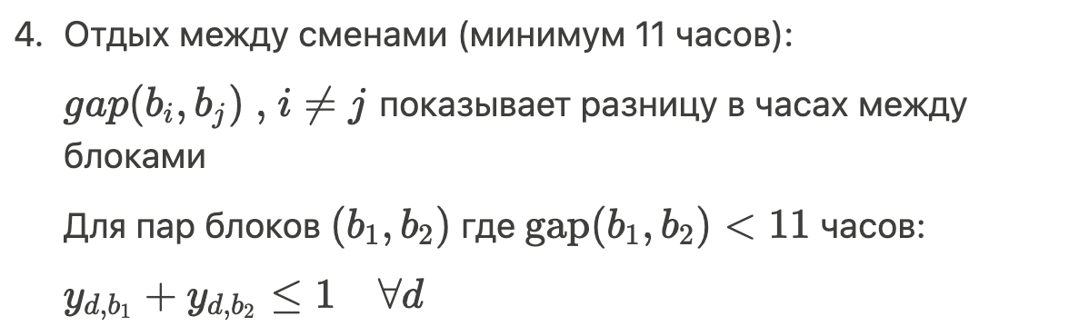 Четвёртое важное ограничение — требования к отдыху между сменами. Если интервал между окончанием одного блока и началом другого составляет менее 11 часов, один и тот же водитель не может быть назначен на оба блока. Это условие моделируется неравенством для каждой такой пары блоков: