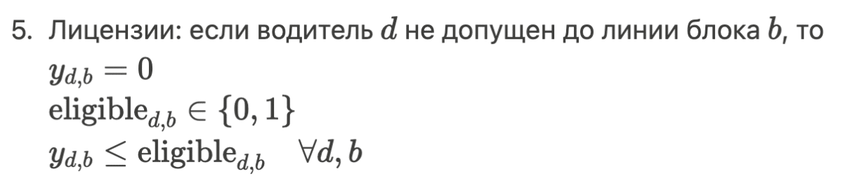 Пятое ограничение учитывает квалификацию и допуски водителей. Для каждого сочетания водителя и блока задаётся параметр eligible_(d,b), равный единице, если водитель имеет право выполнять данный блок. Назначение возможно только при наличии соответствующего допуска.