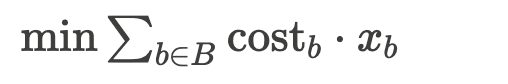 Наконец, целевая функция ставит задачу минимизации общей стоимости выполнения всех активированных блоков, что выражается как сумма произведений стоимости каждого блока на соответствующую переменную x_b.