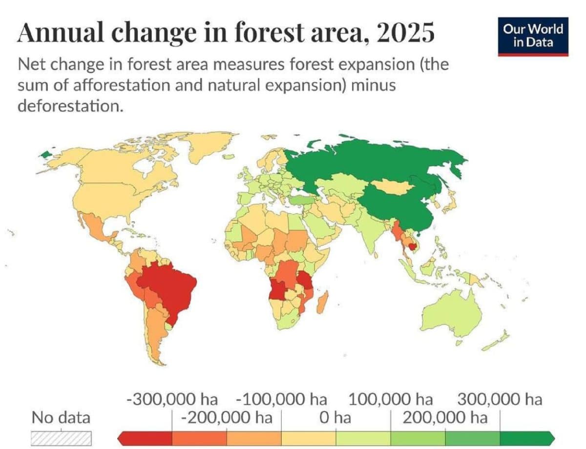 Леса занимают почти треть суши Земли. На инфографике показано, как изменилась площадь лесов в странах мира в 2025 году. Изменение площади лесов рассчитывается как разница между расширением лесов и вырубкой.