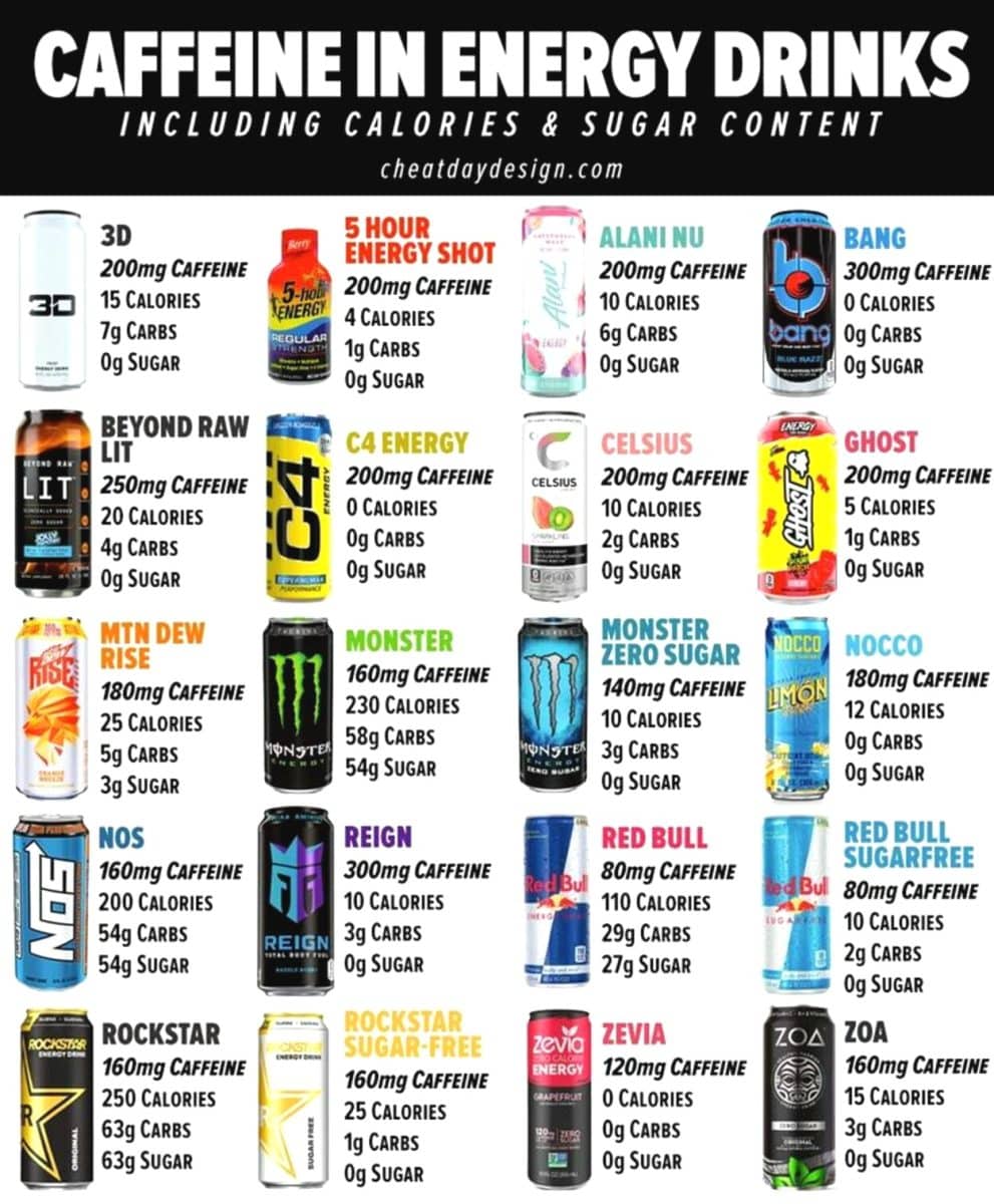 Beyond Raw Lit — еще один энергетик с высоким содержанием кофеина — 250 миллиграмов на банку в 473 миллилитра. По 200 миллиграмов кофеина оказалось в напитках 3D, 5-hour Energy Shot, C4 Energy, Alani Nu, Celsius и Ghost. Объем банок у этих брендов отличается. Так, 5-hour Energy Shot продают в маленьких бутылочках по 57 миллилитров. Самый низкий уровень кофеина — у обоих вариантов Red Bull. В банках по 250 миллилитров содержится 80 миллиграммов кофеина.