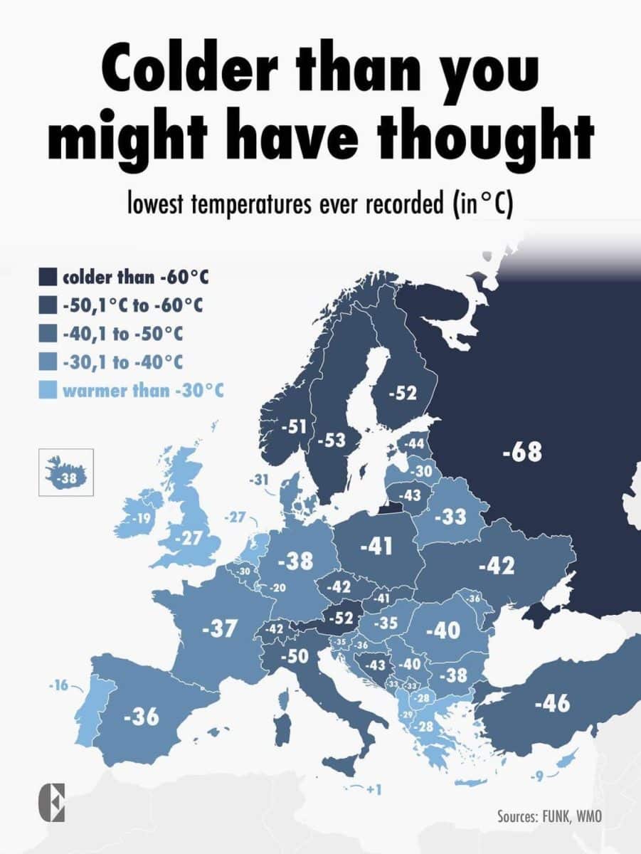 Большинство стран Европы хотя бы раз сталкивались с сильными холодами. На инфографике показаны самые низкие температуры, когда-либо зарегистрированные в странах Европы.