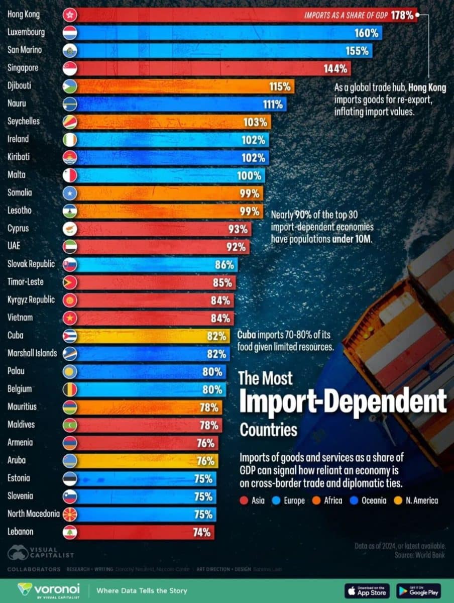 На инфографике выше представлены страны с наибольшей долей импорта по отношению к Валовому внутреннему продукту (ВВП) на основе данных Всемирного банка. Лидером мирового рейтинга стал Гонконг, где объем импорта составляет 178% ВВП.