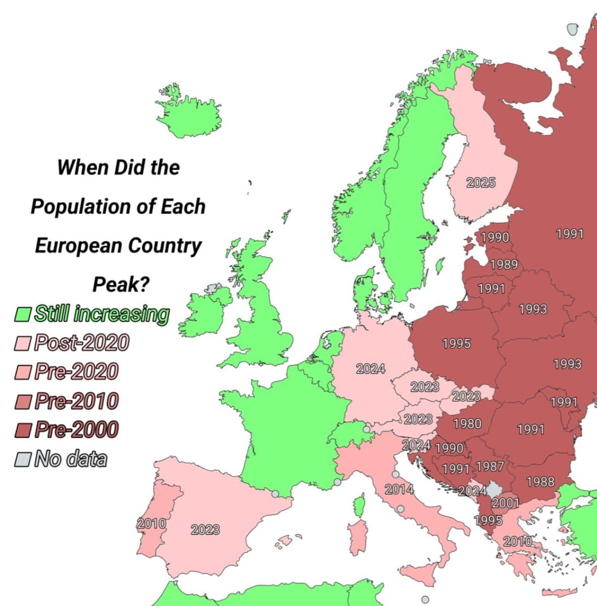 Демографическая ситуация в Европе меняется неравномерно. На карте показано, когда численность населения европейских стран достигла своего исторического пика.