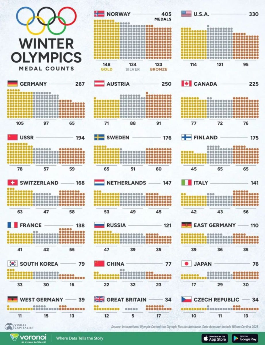 Норвегия уверенно занимает первое место — 405 медалей, из которых 148 золотых, завоеванных на протяжении 24 зимних Олимпиад.