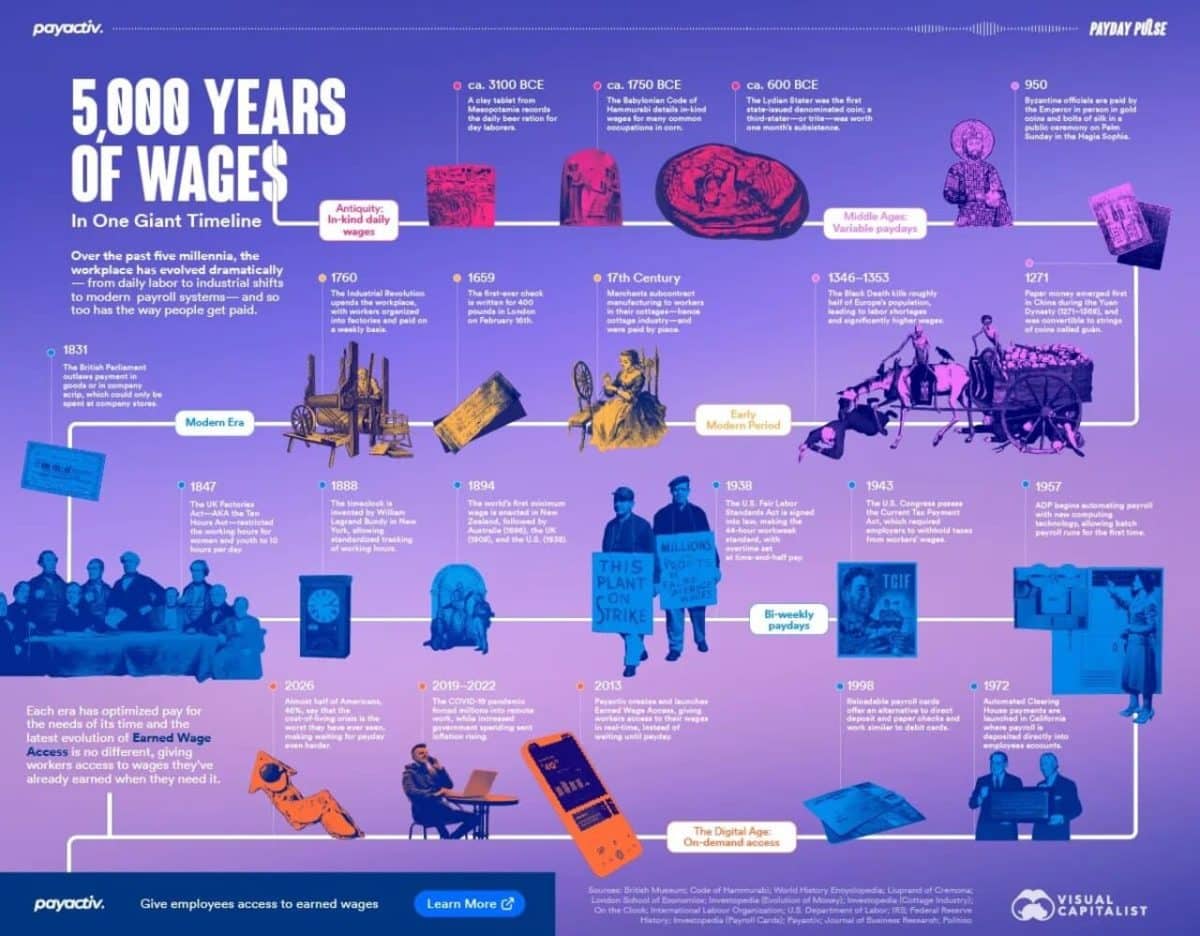 Инфографика, представленная выше, прослеживает 5000 лет истории заработной платы на основе данных из различных источников.