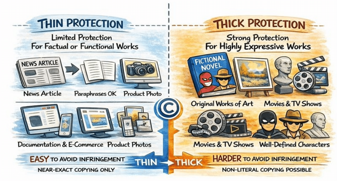 Авторское право не является абсолютной защитой, а скорее спектром, определяемым степенью оригинальности и выразительности произведения. Произведения, основанные на функциональных или общепринятых элементах, получают лишь ограниченную, так называемую «тонкую» защиту авторских прав. Это означает, что защита распространяется лишь на уникальные детали, а не на саму идею или концепцию.