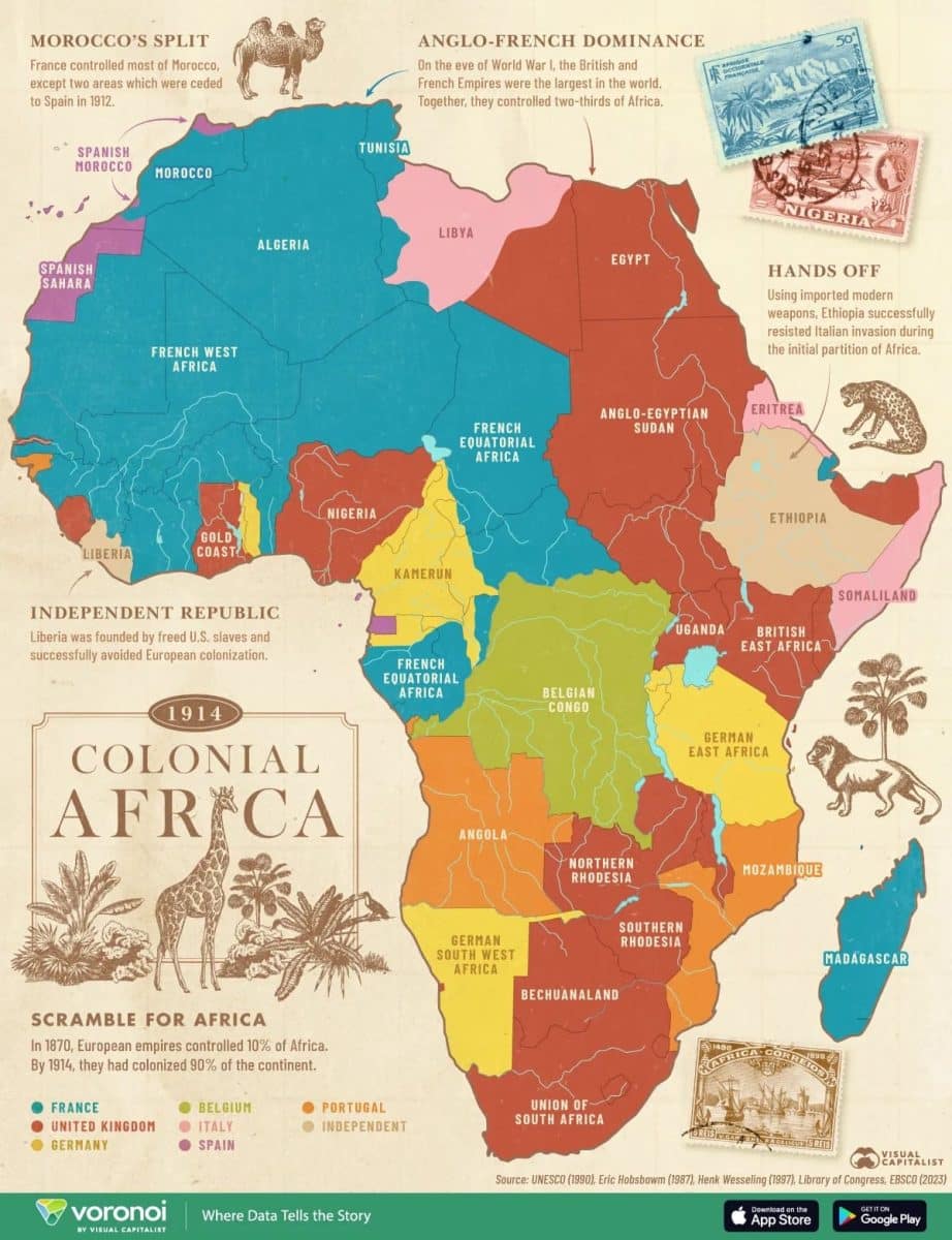 Карта выше иллюстрирует момент наивысшего расцвета колониальной системы — накануне Первой мировой войны, когда европейская власть распространялась почти на всю Африку, прежде чем война начала разрушать заморские владения Европы.