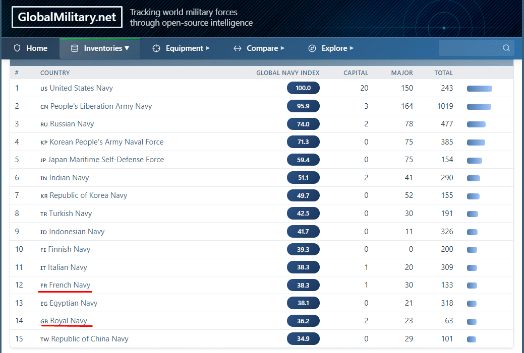 ВМС США занимают первое место с оценкой 100, отражающей их способность действовать одновременно на нескольких океанских театрах. Несмотря на то, что численно американский флот не является крупнейшим, он сочетает в себе авианосцы, ядерные подводные лодки и современные эсминцы, что позволяет проецировать мощь по всему миру.