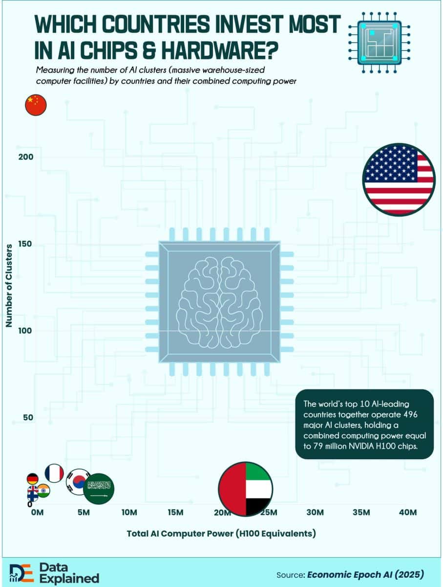 По данным Epoch AI dataset, топ-10 стран-лидеров в области искусственного интеллекта вместе управляют 496 крупными ИИ-кластерами. Они обладают совокупной вычислительной мощностью, эквивалентной 79 миллионам чипов NVIDIA H100.