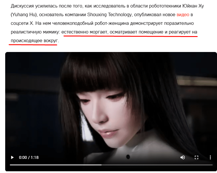 Дискуссия усилилась после того, как исследователь в области робототехники Юйхан Ху (Yuhang Hu), основатель компании Shouxing Technology, опубликовал новое видео в соцсети X. На нем человекоподобный робот-женщина демонстрирует поразительно реалистичную мимику: естественно моргает, осматривает помещение и реагирует на происходящее вокруг.