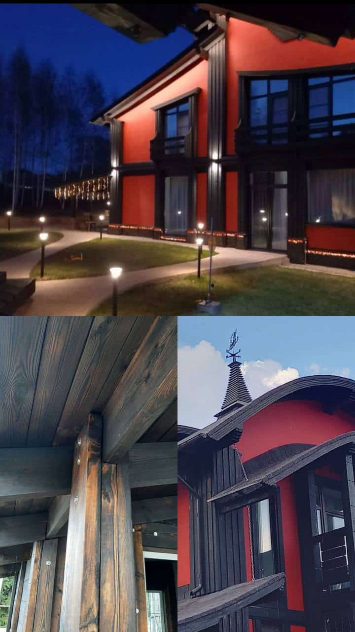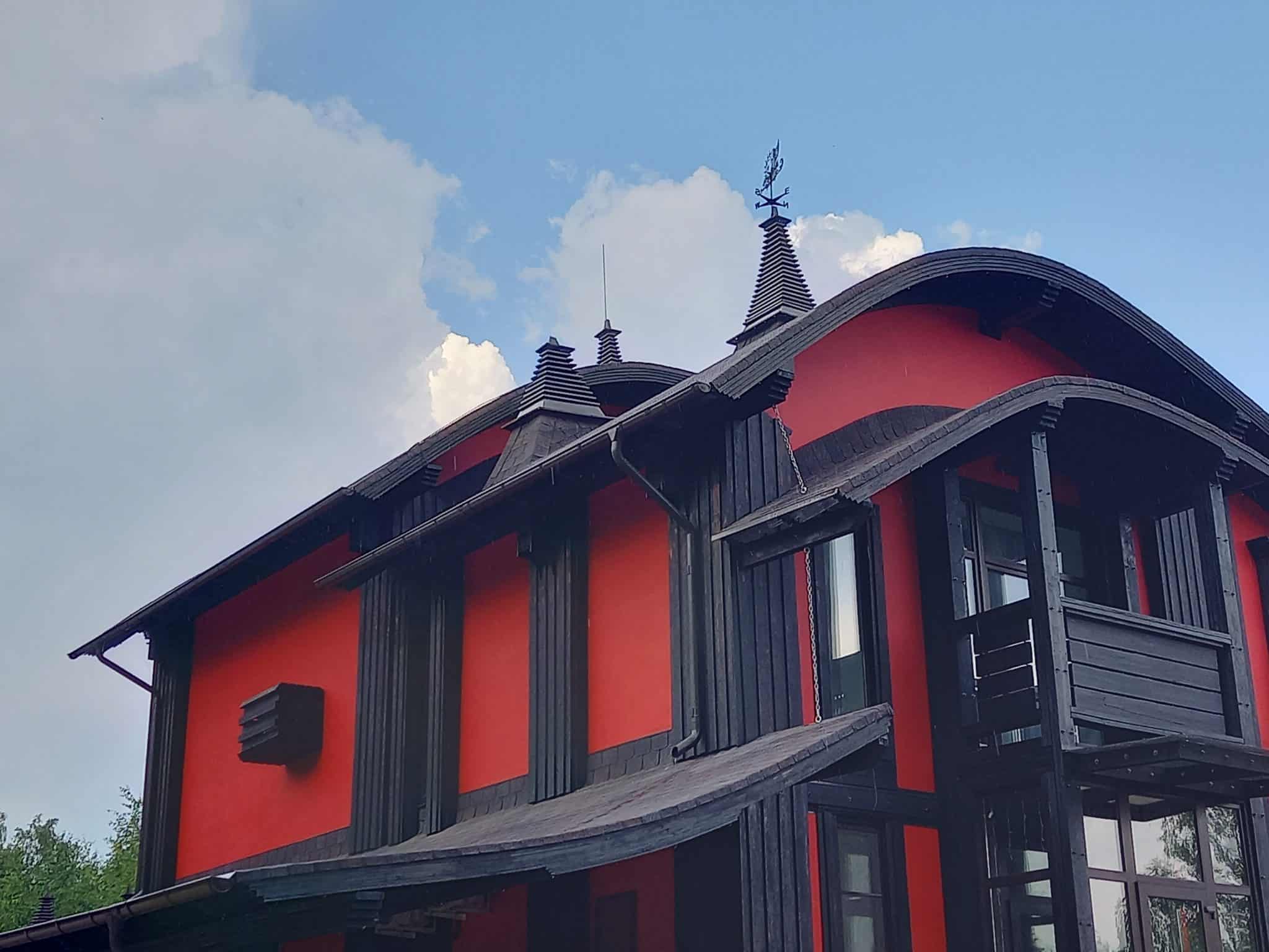 Нижняя часть стен выполнена из кирпича, а верх облицован глиняной черепицей, которая перекликается с выразительной, словно струящейся крышей.