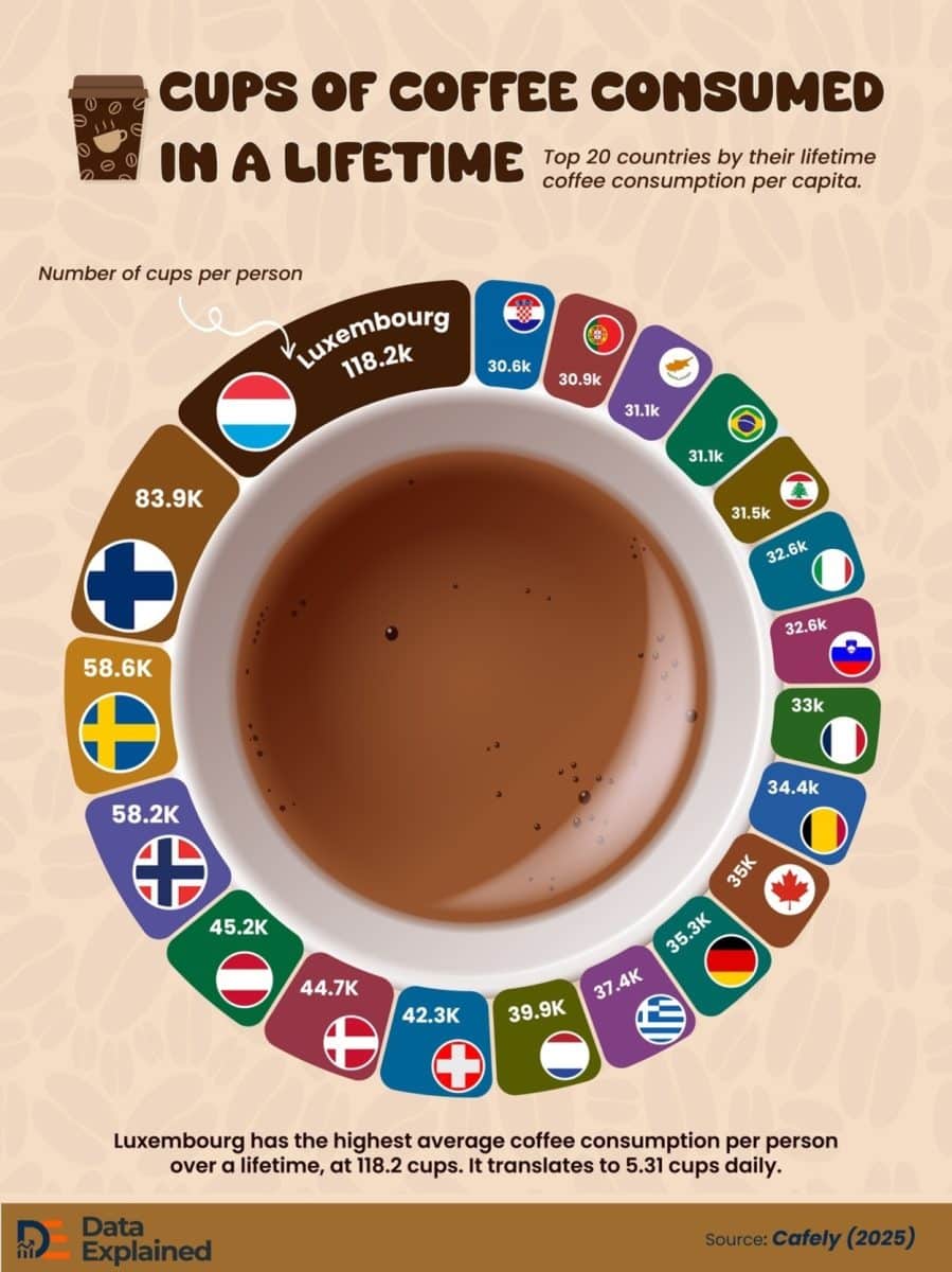 Кофе стал любимым напитком миллионов человек по всему миру. Однако его популярность зависит от страны. На инфографику попали страны, жители которых выпивают больше всего чашек кофе за свою жизнь.