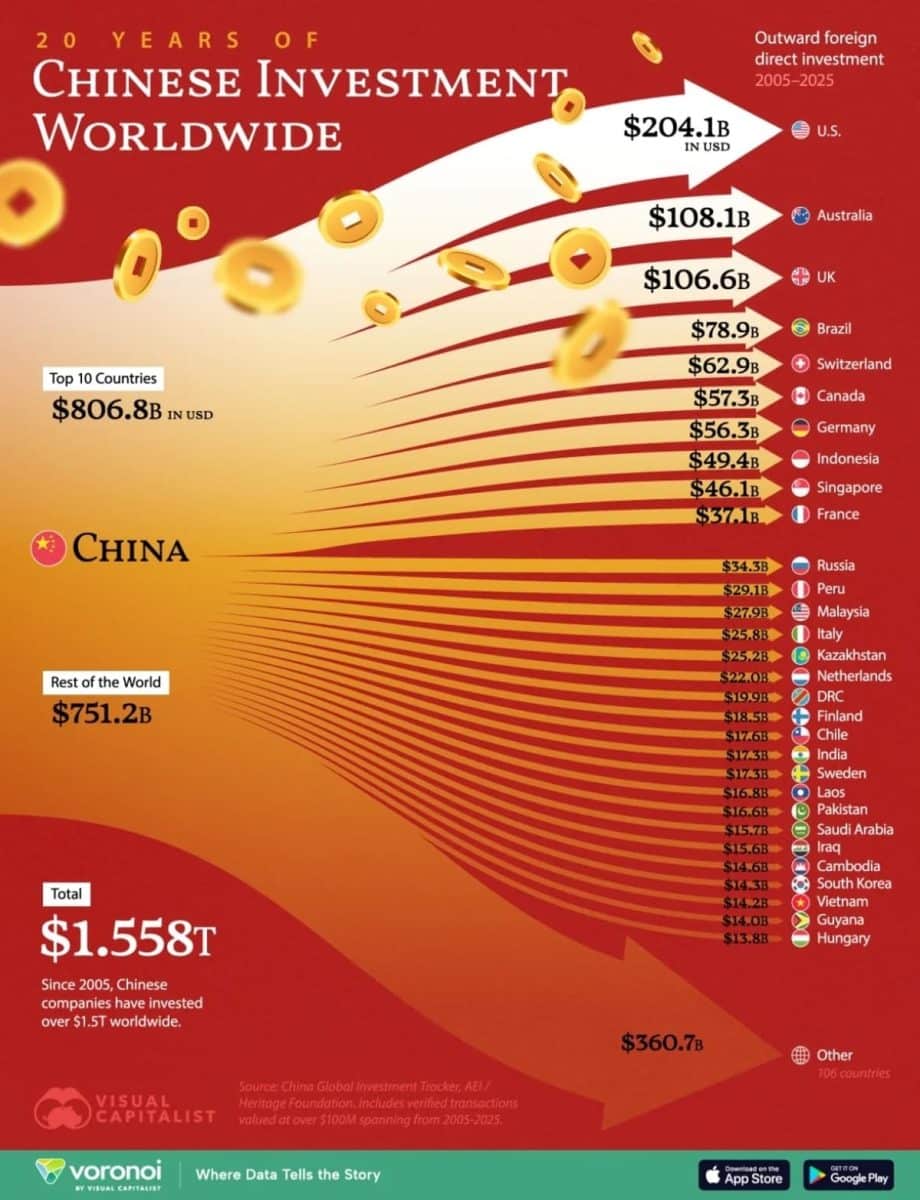 В период с 2005 по 2025 год китайские компании инвестировали за рубежом более 1,5 триллиона долларов. При этом свыше половины этой суммы (806,8 миллиарда долларов) пришлось всего на десять стран. В расчет включались только сделки стоимостью от 100 миллионов долларов.