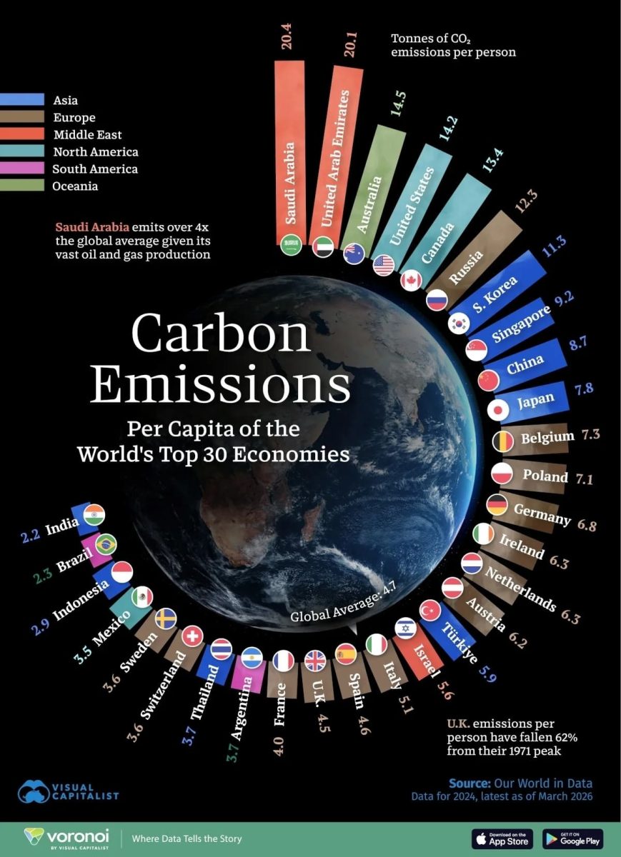 От нефтедобывающих государств до индустриальных гигантов — последние данные Our World in Data показали, что место проживания напрямую влияет на личный углеродный след: в некоторых странах показатель на человека почти в десять раз выше, чем в других. В Саудовской Аравии и ОАЭ выбросы превышают 20 тонн CO₂ на человека, что обусловлено энергоемкими отраслями, зависимостью от ископаемого топлива и относительно небольшой численностью населения.