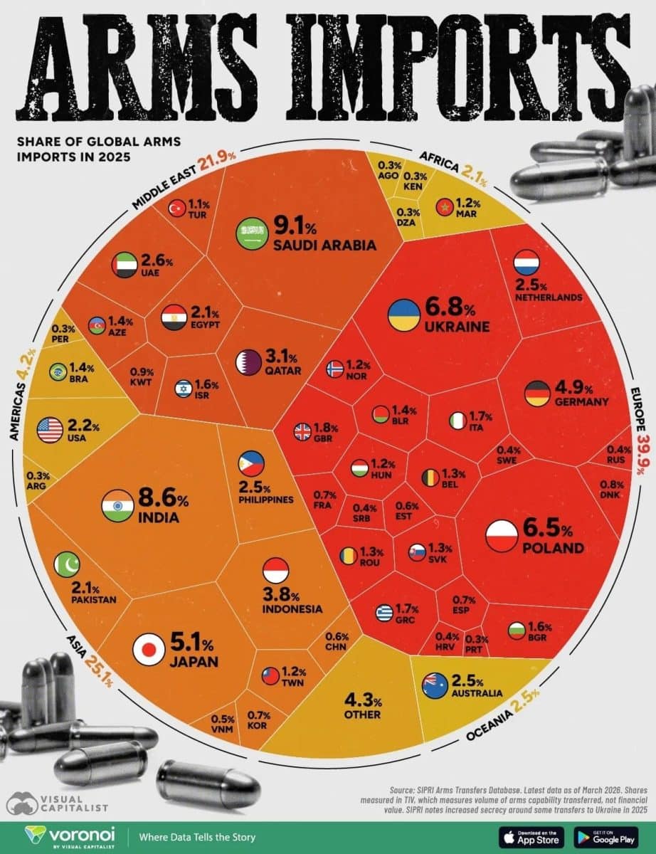 Данная инфографика представляет крупнейших импортеров вооружений в мире в 2025 году на основе данных базы SIPRI Arms Transfers Database (март 2026 года). Она показывает, какие страны формируют рост оборонных расходов и где спрос увеличивается наиболее стремительно.