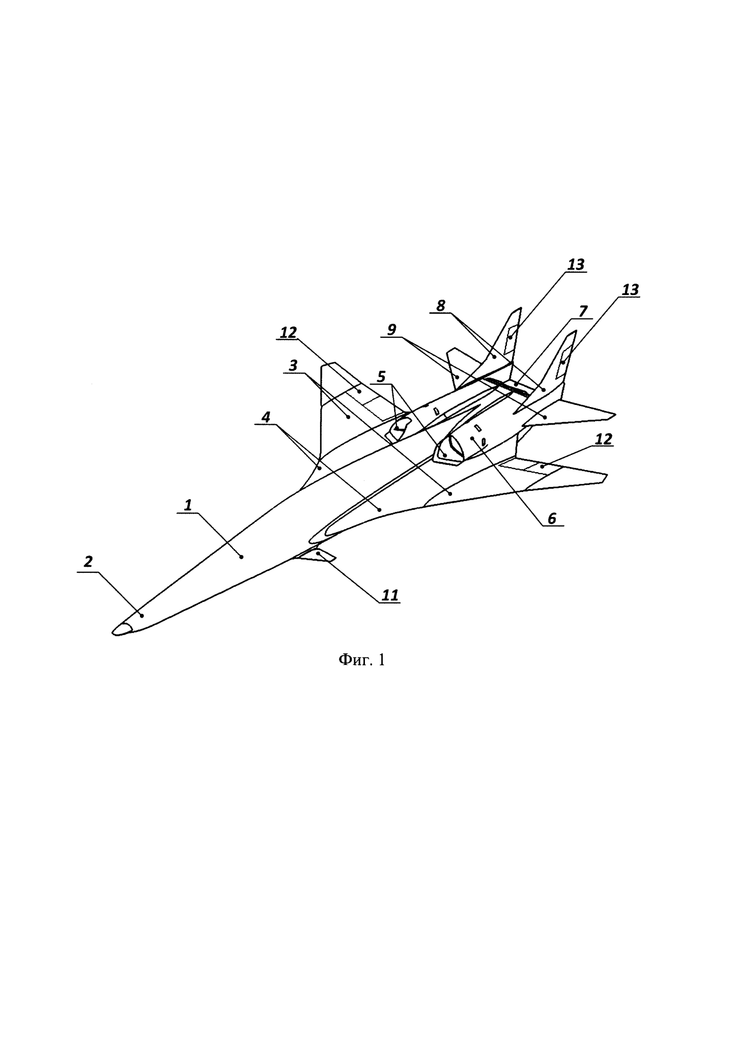 В патенте приведен комплекс инженерных решений, включая особенности аэродинамики и компоновки. В частности, предусмотрены стреловидное крыло и мотогондола с расположенной в ней силовой установкой, состоящей из двух с надкрыльевыми воздухозаборниками и соплами.